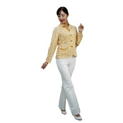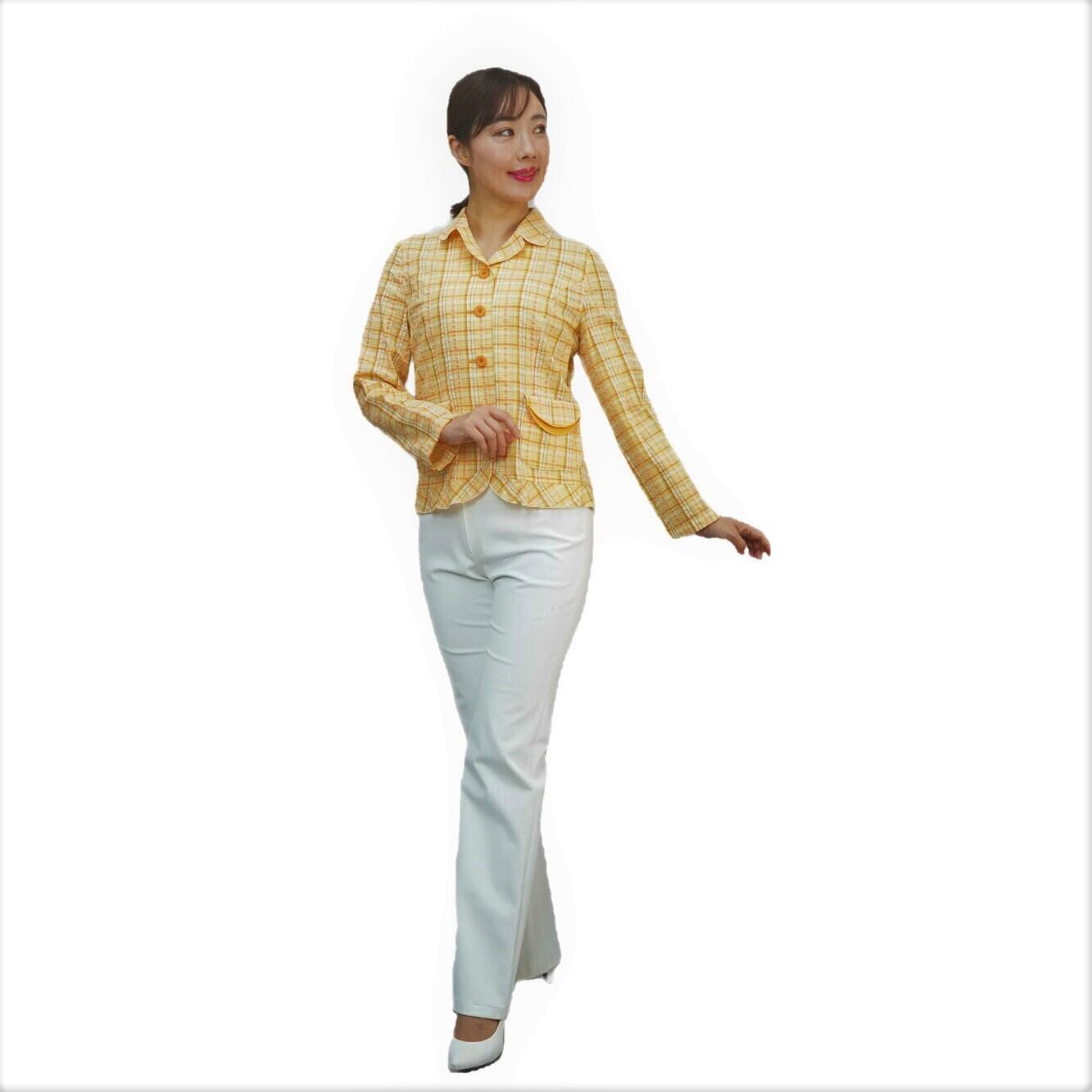 可愛い雰囲気のオレンジのジャケット。ポケットが面白く入れる場所が2か所あり、裾のフリル共に可愛いです.モデルの身長は168㎝です。