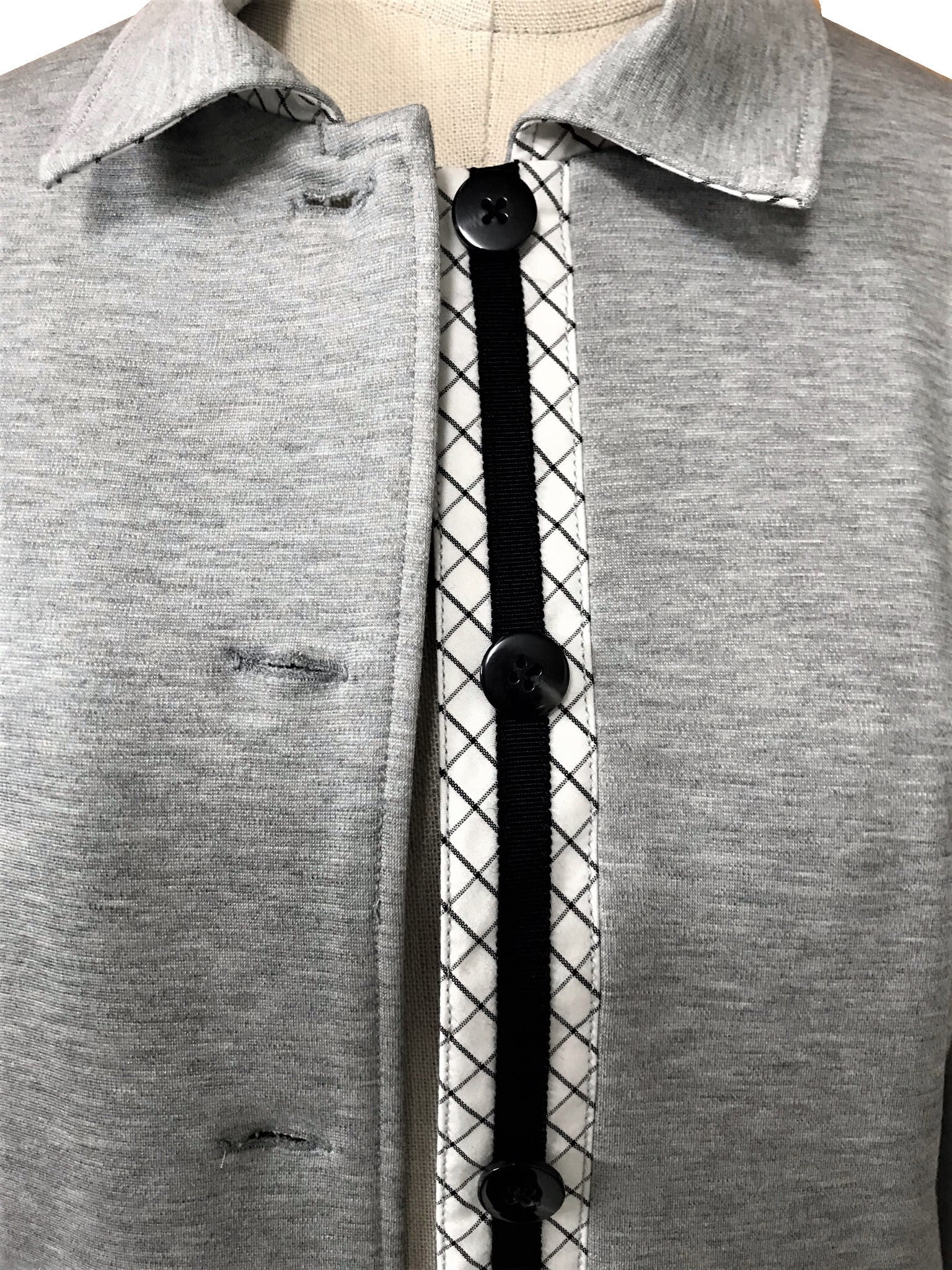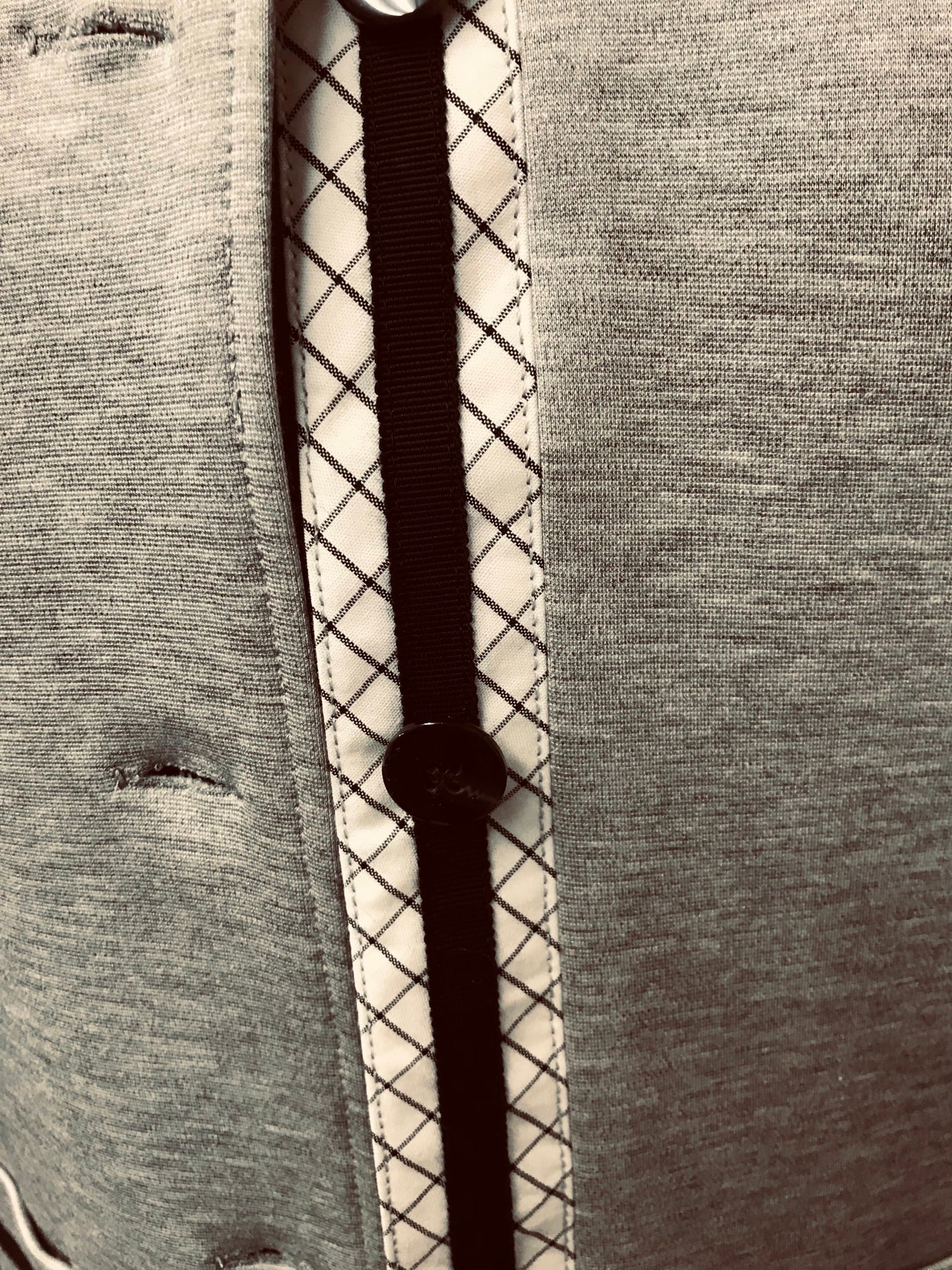 地襟と下前立てにチェック柄の生地を使い、前立てと、ポケット口には黒無地の