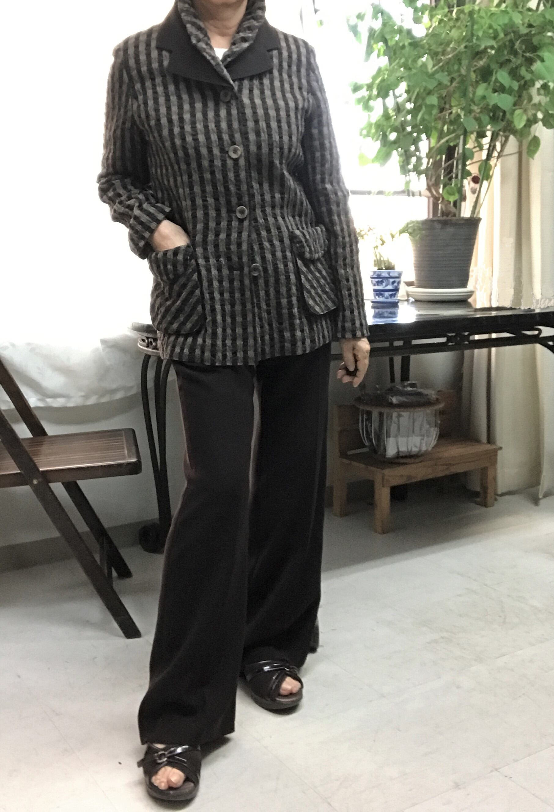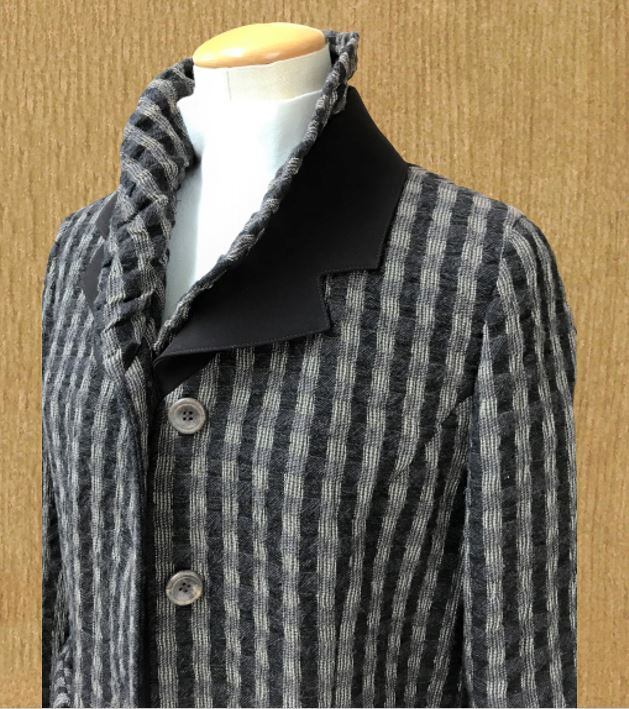 襟は無地の別襟を重ねて2枚になっていて、上衿の周りにはワイヤーが入っていて形を好きな様に形作れます。パッチポケトも無地のマチを挟んでいて立体的になっています。高級感が有り着やすくオシャレなジャケットです。